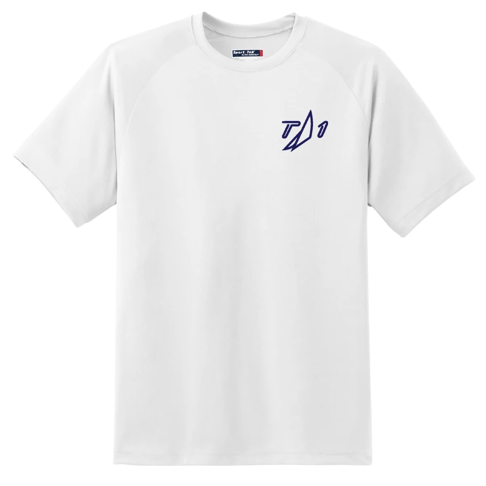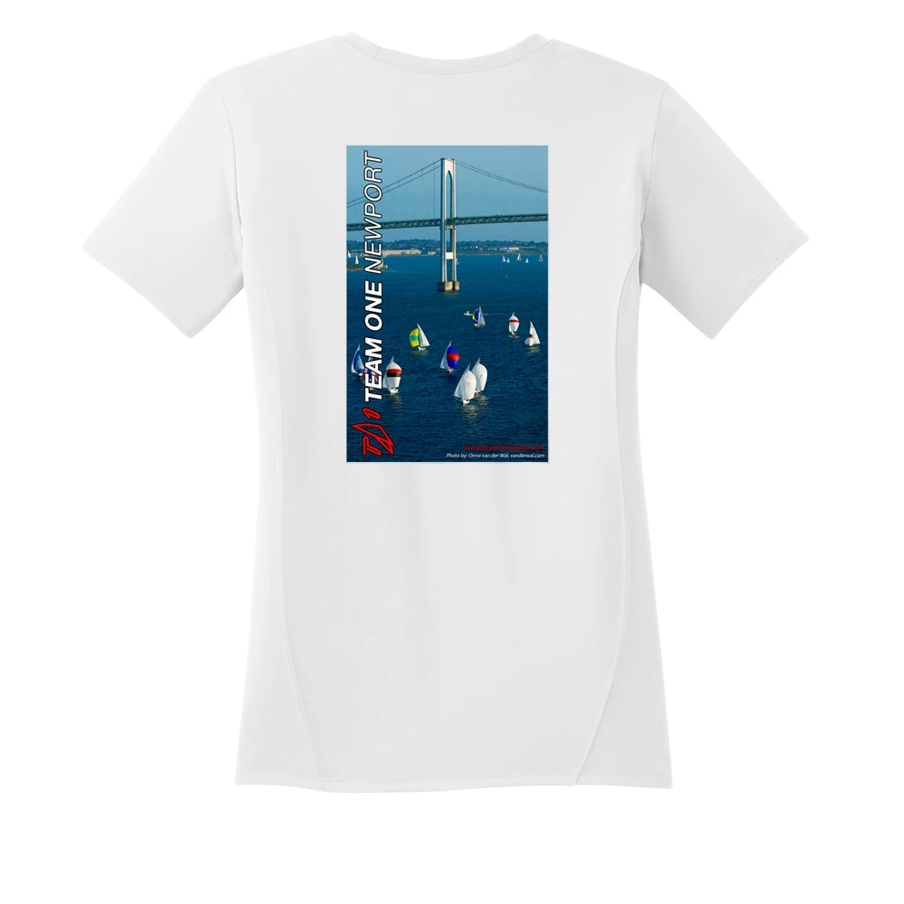 This woman’s tech tee is sublimated with a beautiful picture by Onne Van Der Wal of the shields class racing past the Newport Bridge. It also features the Team One Newport sail logo on the left chest.